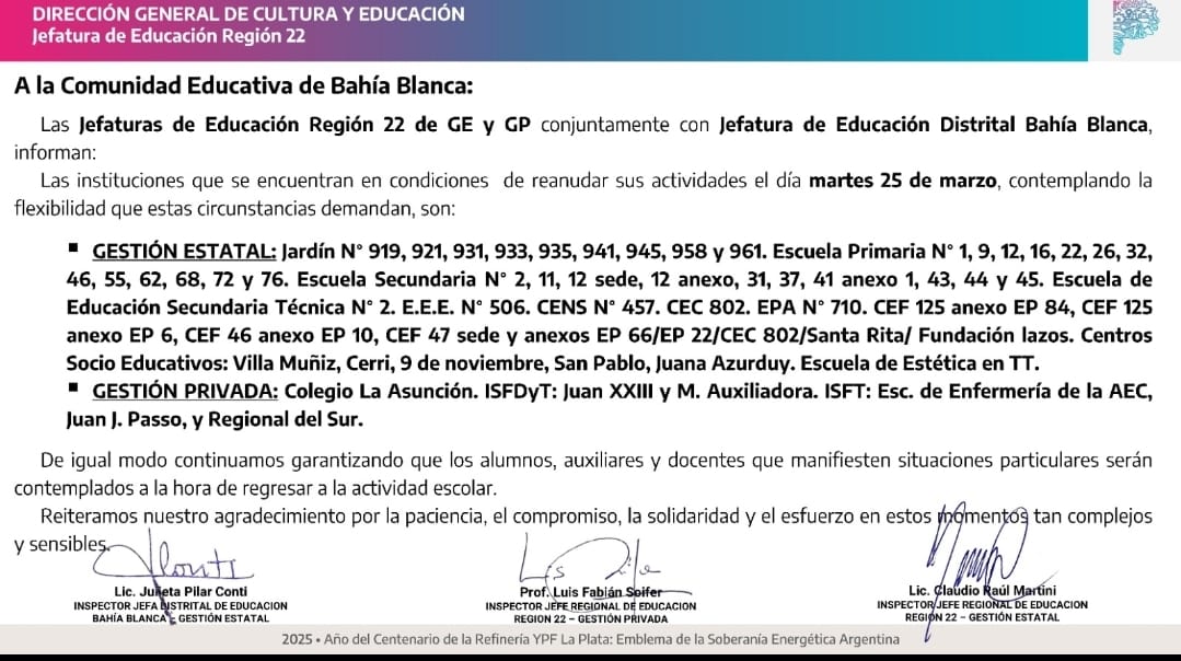 Las jefatura Regional y Distrital de Educación consideraron en relación a distintas variables, que están en condiciones de reanudar el ciclo lectivo estos jardines y escuelas: