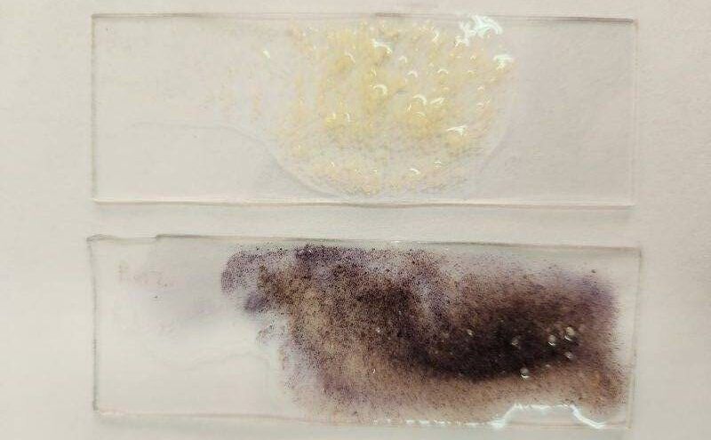 La prueba del yodo: al colocar una gota de Pervinox en una mezcla con agua y harina, si cambia a color violeta significa que hay almidón.
