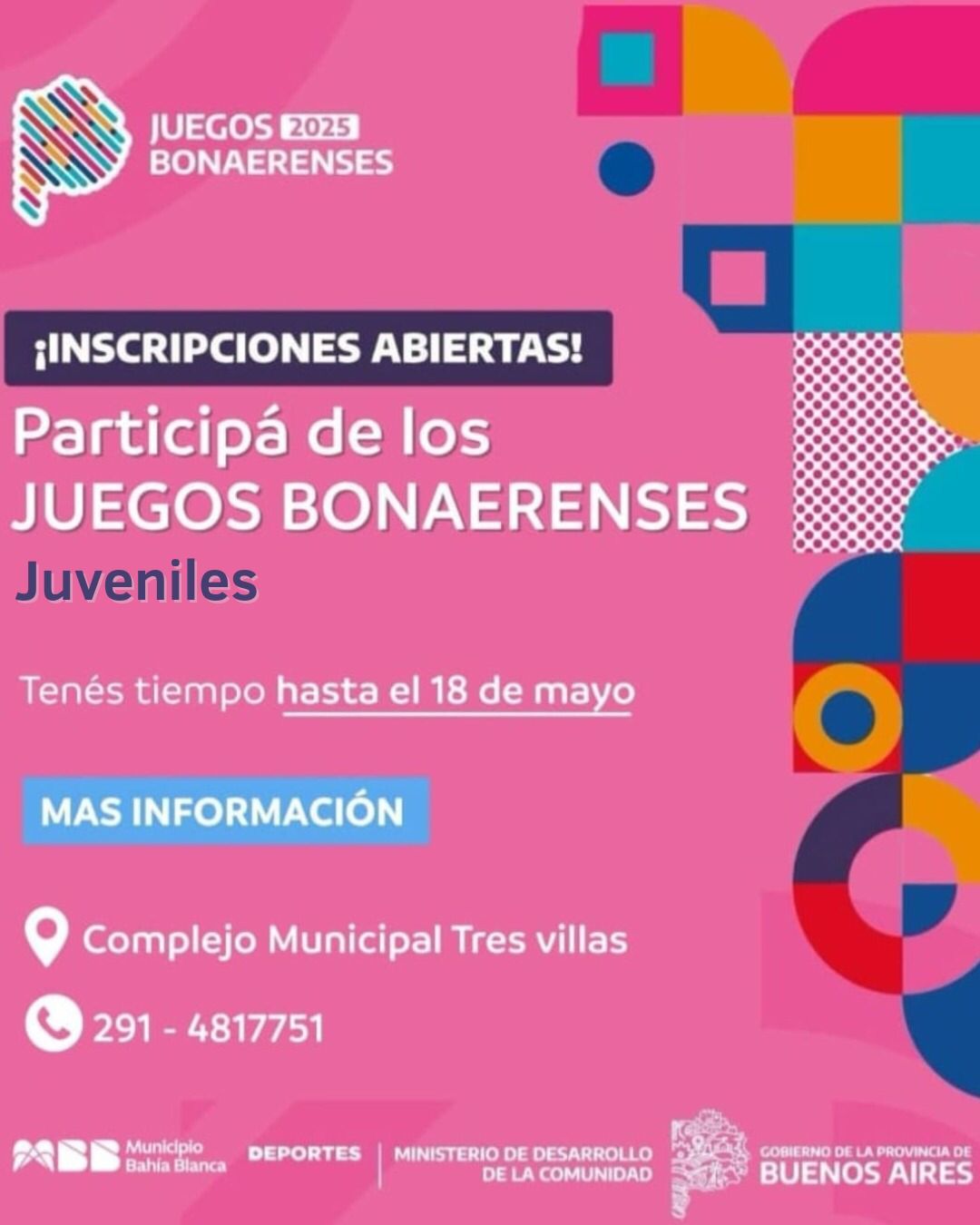 Los interesados pueden hacerlo en juegos.gba.gob.ar/inscripcion-2025 y para más información, se tienen que comunicar al 291 4817751 (Complejo Las Tres Villas).