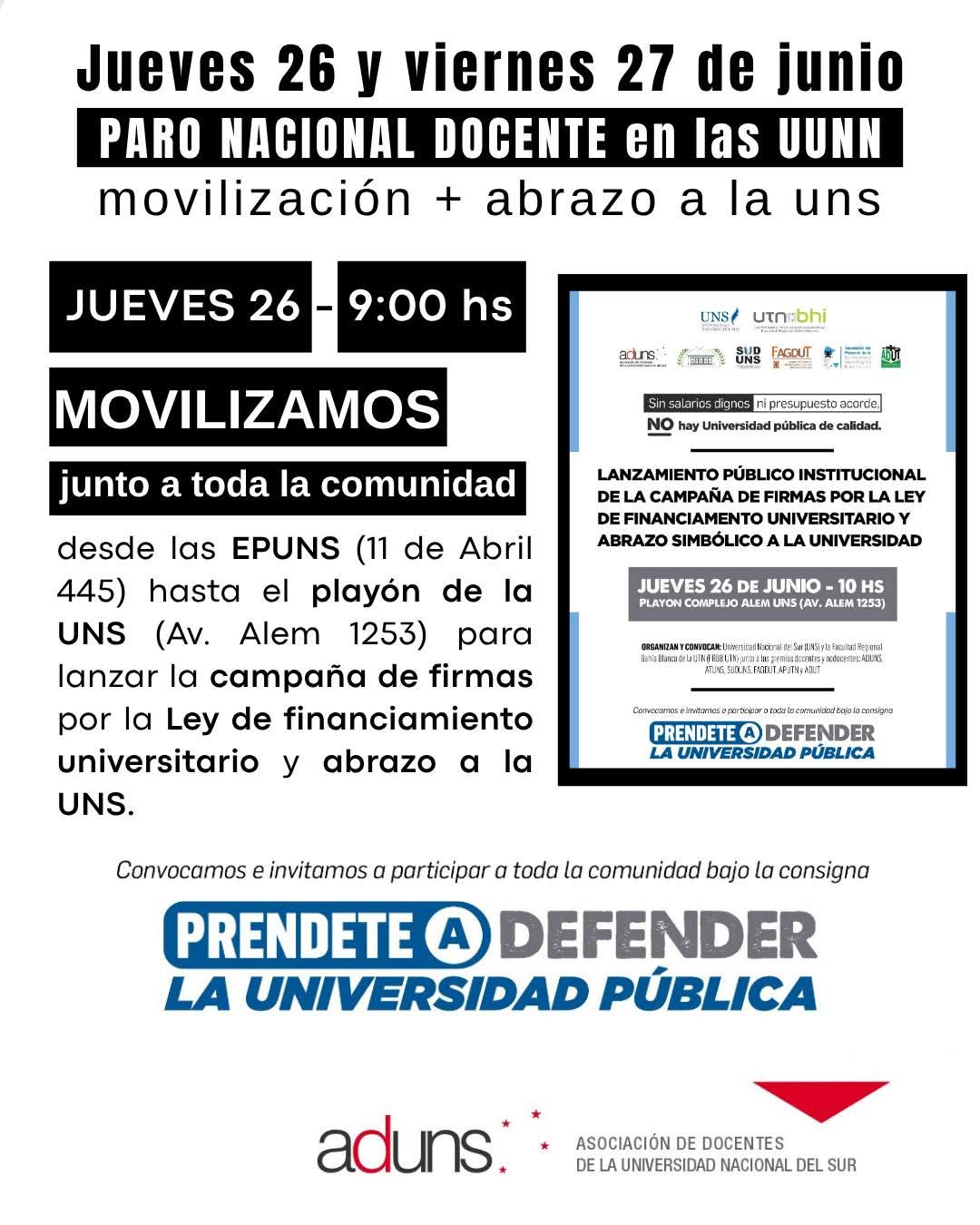 El sindicato de docentes Aduns adhiere al paro convocado por Conadu en todo el país, que va a incluir además la Marcha Federal y un abrazo simbólico a la institución.