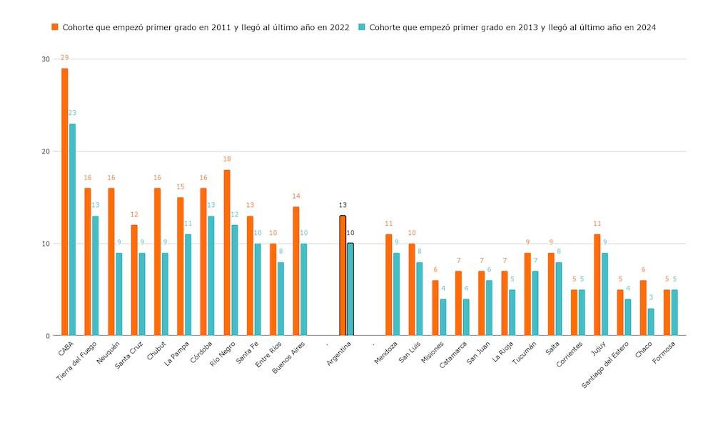 Como ejemplo, en Chaco, de cada 100 estudiantes que empiezan primer grado, solo 3 llegan al último año de la secundaria en tiempo y forma. Y en CABA, el 23 %.