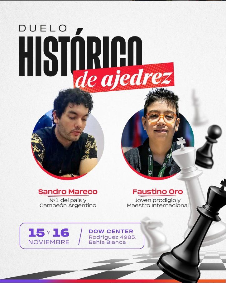 Lo va a hacer en un enfrentamiento en Dow Center con Sandro Mareco, el Nº 1 del país, a 6 partidas rápidas, de 20 minutos y 10 segundos por jugada.