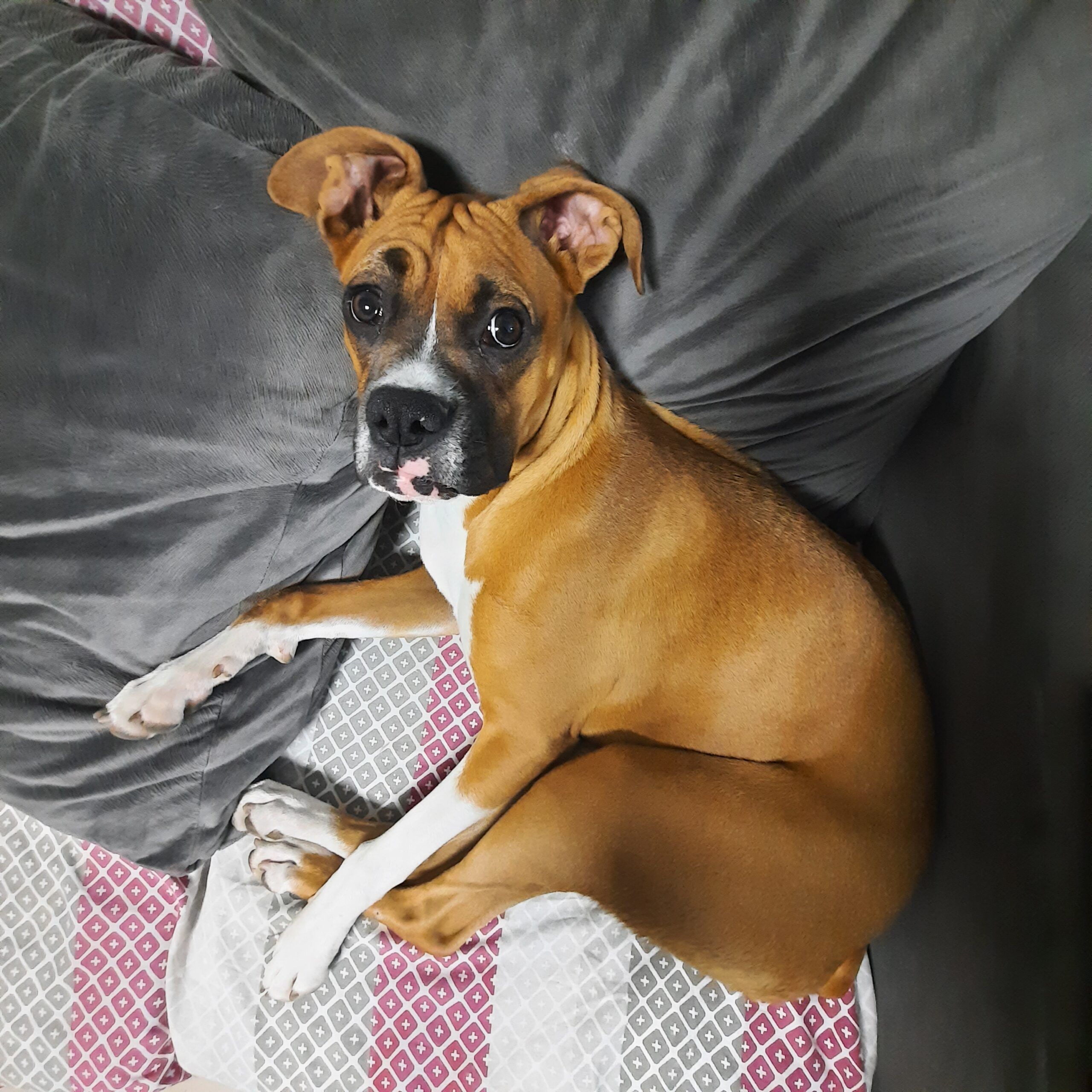 Es una boxer de 1 año, con una mancha blanca detrás del cuello, sin collar. Es muy juguetona y amistosa con otros perros.
