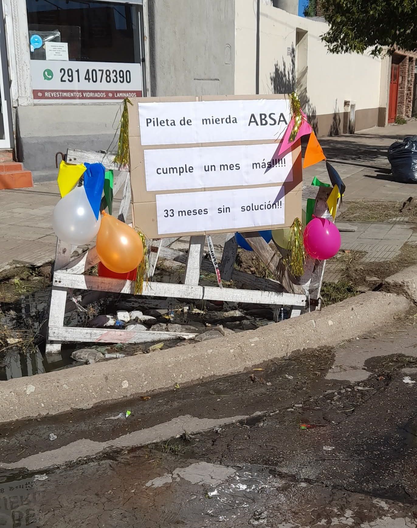 “33 meses sin solución”, dice un cartel con globos colocado en esa esquina con liquidos cloacales.