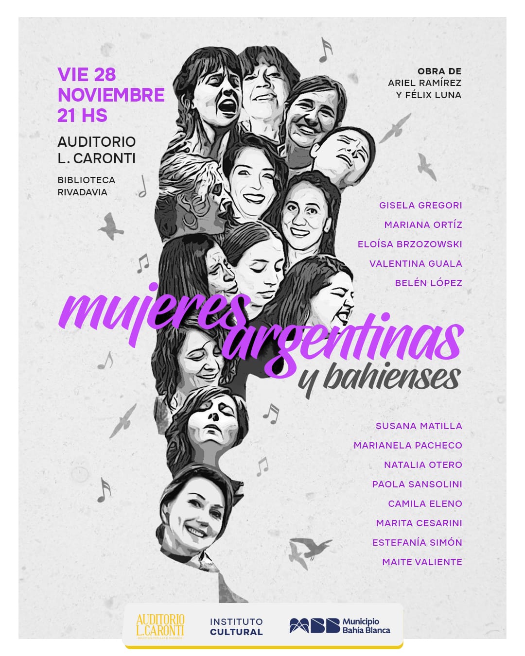 El viernes 28 de noviembre, a las 21 horas en el auditorio de la Biblioteca Rivadavia, se vuelve a presentar la obra Mujeres Argentinas, de Ariel Ramírez y Félix Luna, interpretada por 14 artistas mujeres de Bahía Blanca.
