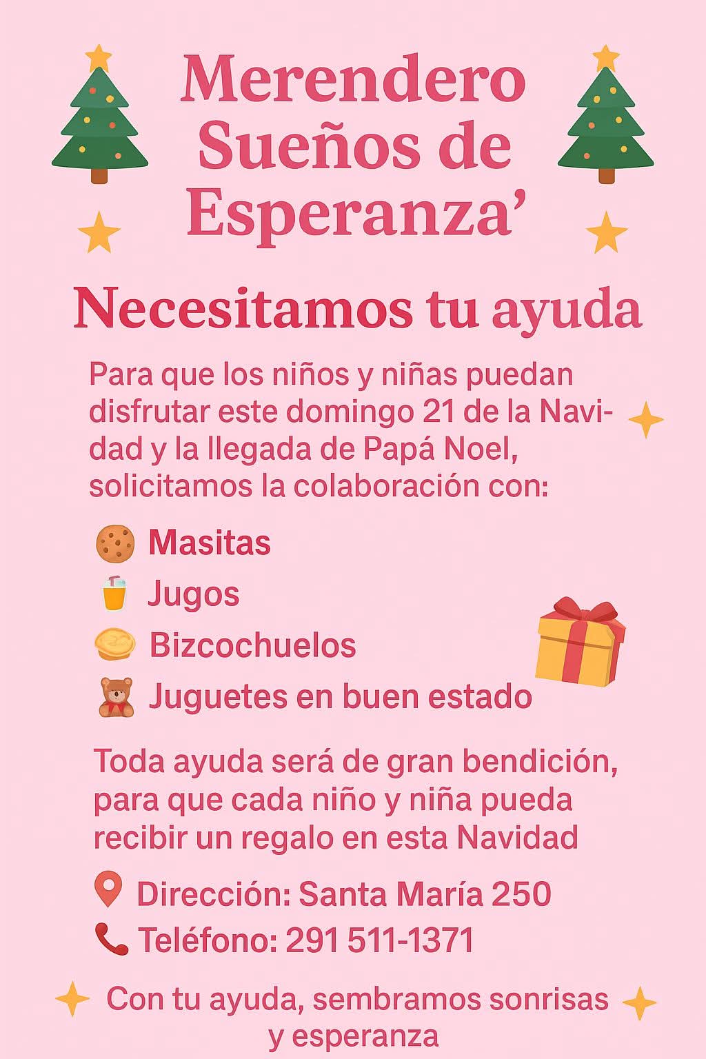 - El merendero “Pequeño gigante” está vendiendo rifas para comprar alimentos para el festival de Navidad, pero también aceptan donaciones. Contactate al 291 5343998.