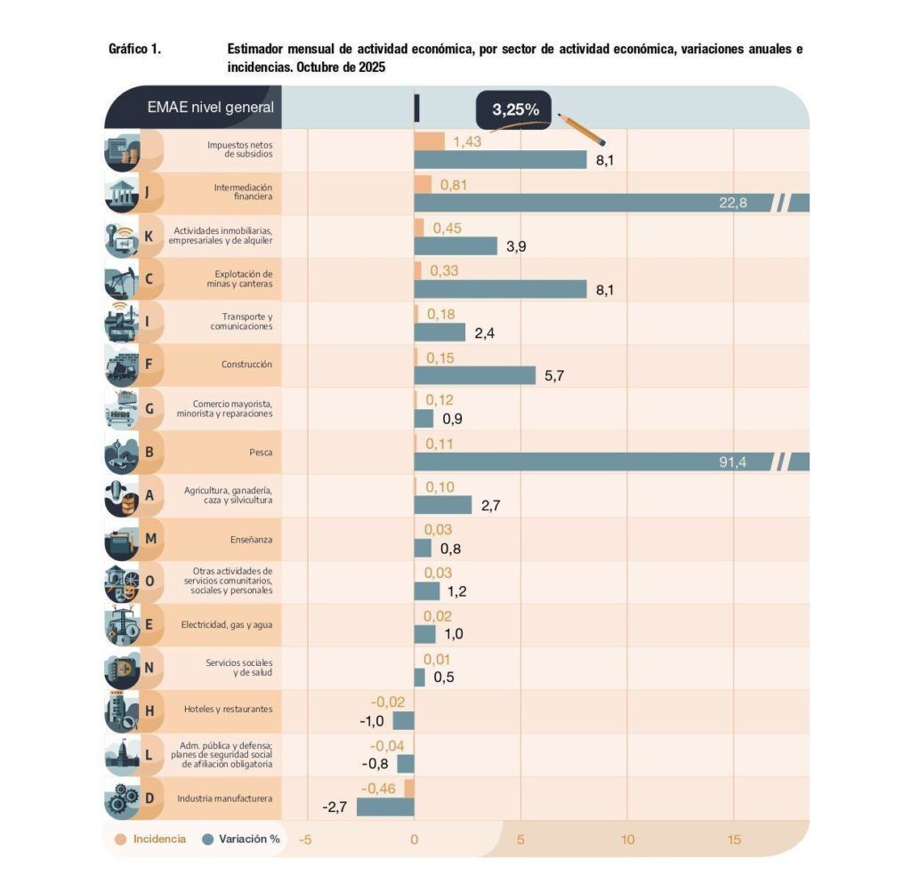 El Estimador Mensual de Actividad Económica (EMAE) es un indicador que muestra la evolución mensual de la actividad económica en distintos sectores productivos. En el informe realizado en diciembre de este año, revela que desde octubre del 2024 a octubre del 2025 hubo un crecimiento del 3,2%.