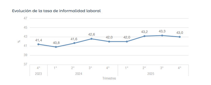 Según la Encuesta Permanente de Hogares realizada por INDEC en el cuarto trimestre de 2025, la tasa de informalidad laboral se ubicó en el 43% hacia fines de 2025, sobre un total de 13,5 millones de personas ocupadas en los principales aglomerados urbanos .