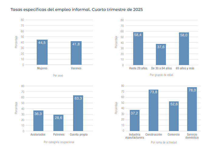 La informalidad no se distribuye de manera uniforme. Afecta más a los jóvenes: casi el 60% de las personas de hasta 29 años trabaja en condiciones informales. También es más alta entre las mujeres, con una tasa del 44,5%, frente al 41,8% en varones .
