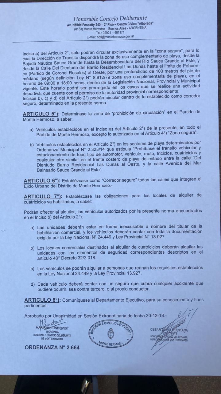 En el caso puntual de Monte Hermoso, existen zonas seguras destinadas a estos vehículos de tipo deportivo (Quads), que son aquellos que no cuentan con ningún tipo de luces (frontales, giro, ni de posición), ni espejos y de escape libre.