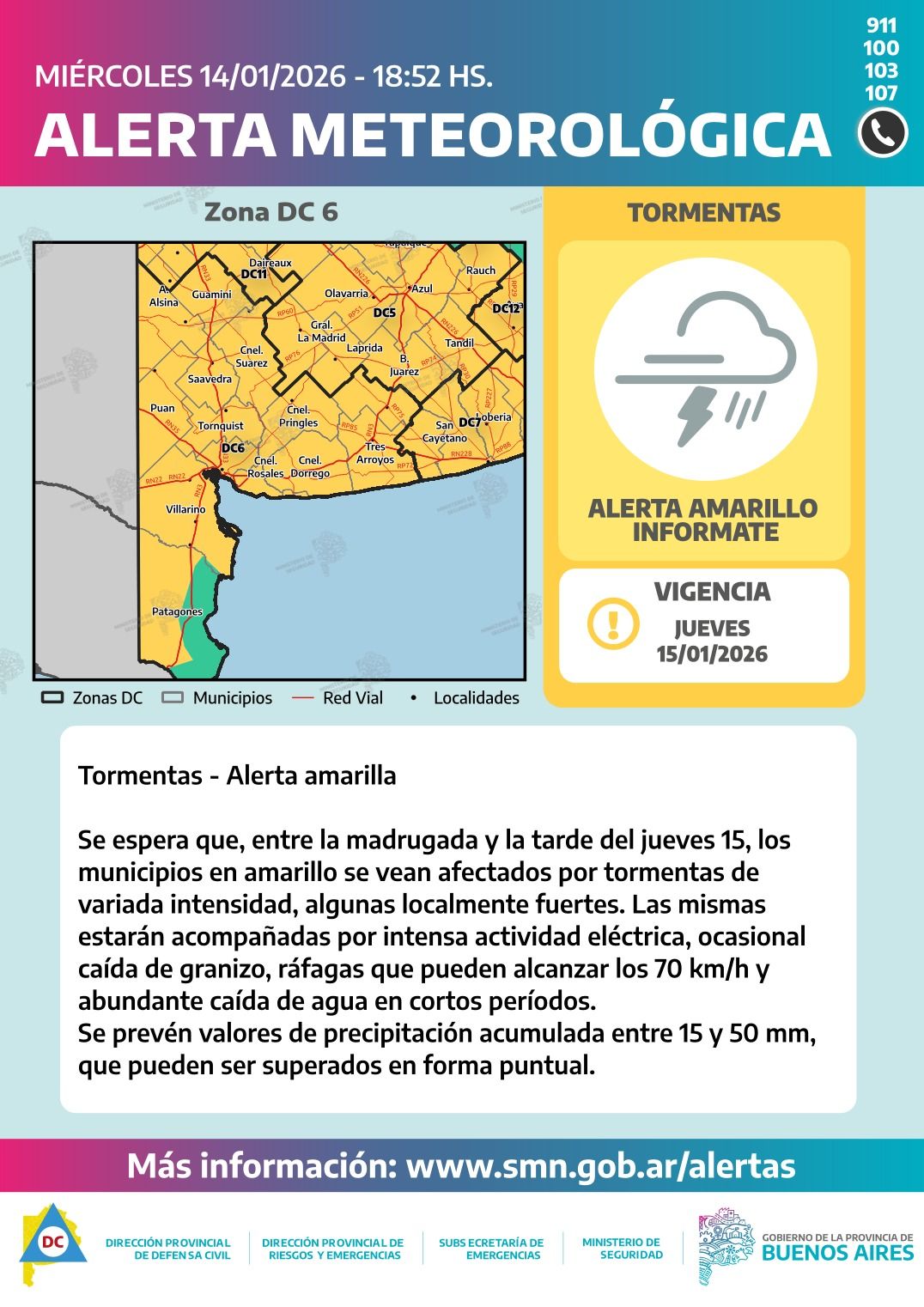 Se estiman valores de lluvia acumulada entre 15 y 50 mm, pudiendo ser superados puntualmente.