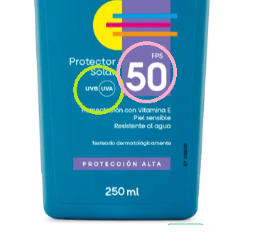 Cuando en el envase del protector solar aparece la sigla UVA rodeada por un círculo, esto indica que la protección frente a los rayos UVA es al menos un tercio (⅓) del valor del FPS, cumpliendo con la normativa de protección de amplio espectro.