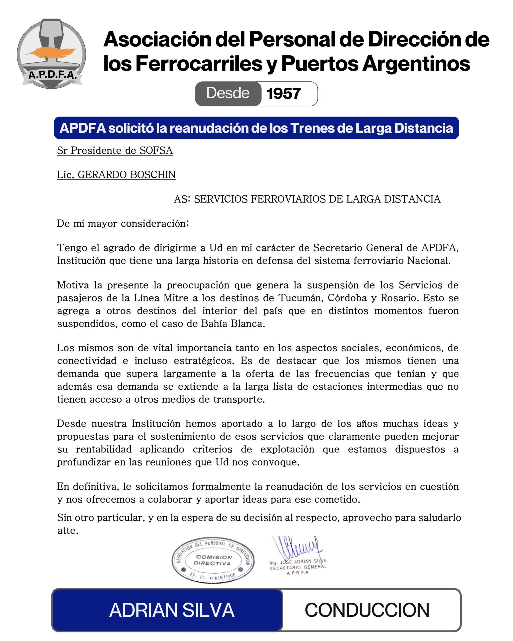 La Asociación del Personal de Dirección de los Ferrocarriles y Puertos Argentinos reclamó la reanudación de los trenes de larga distancia de pasajeros que fueron suspendidos en distintos destinos del país.