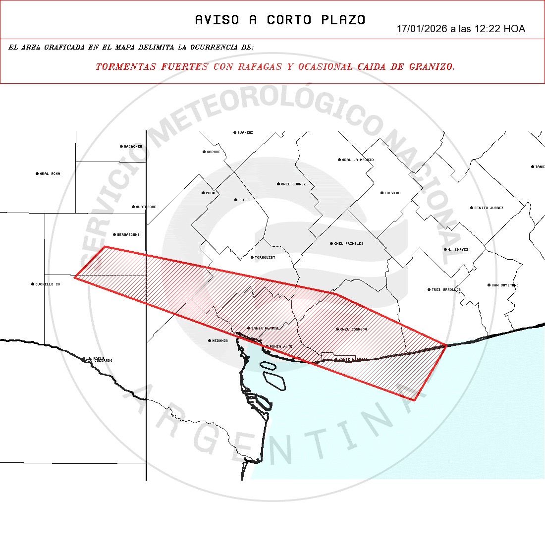El pronóstico alcanza a los partidos de Bahía Blanca, Tornquist, Patagones, Puan, Villarino.