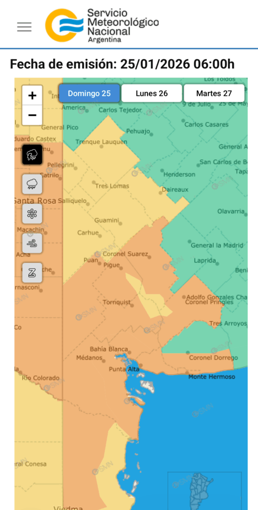 El SMN informa que rige un alerta para la tarde y noche de hoy en el sector norte del distrito de Bahía Blanca, esto es, Corti y Cabildo.