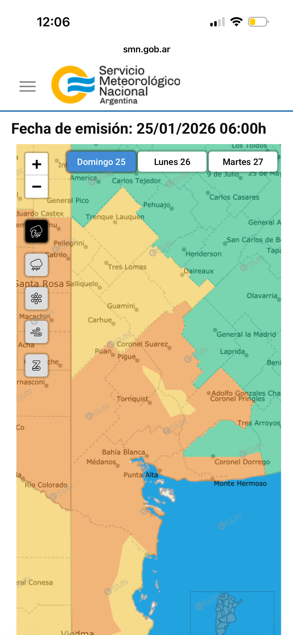El SMN informa que rige un alerta para la tarde y noche de hoy en el sector norte del distrito de Bahía Blanca, esto es, Corti y Cabildo.