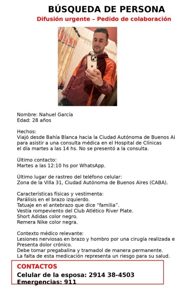 Nahuel tiene parálisis en el brazo izquierdo y un tatuaje en el antebrazo con la palabra “familia”. Al momento de su desaparición vestía un rompeviento de River Plate, short negro Adidas y remera negra Nike.