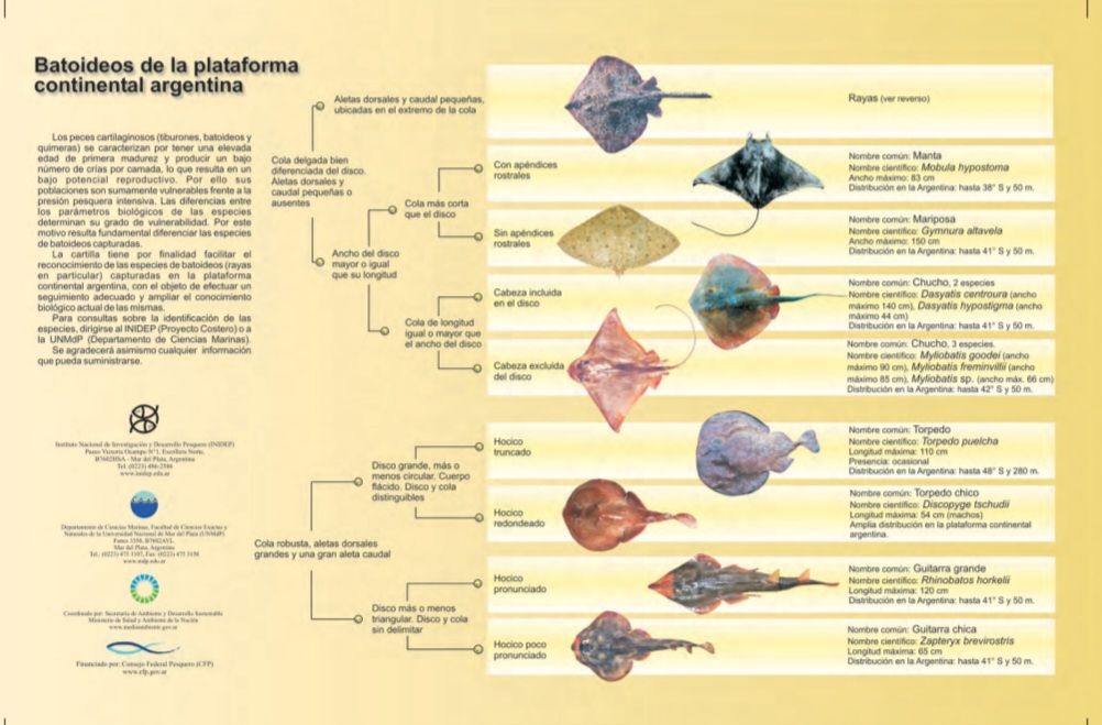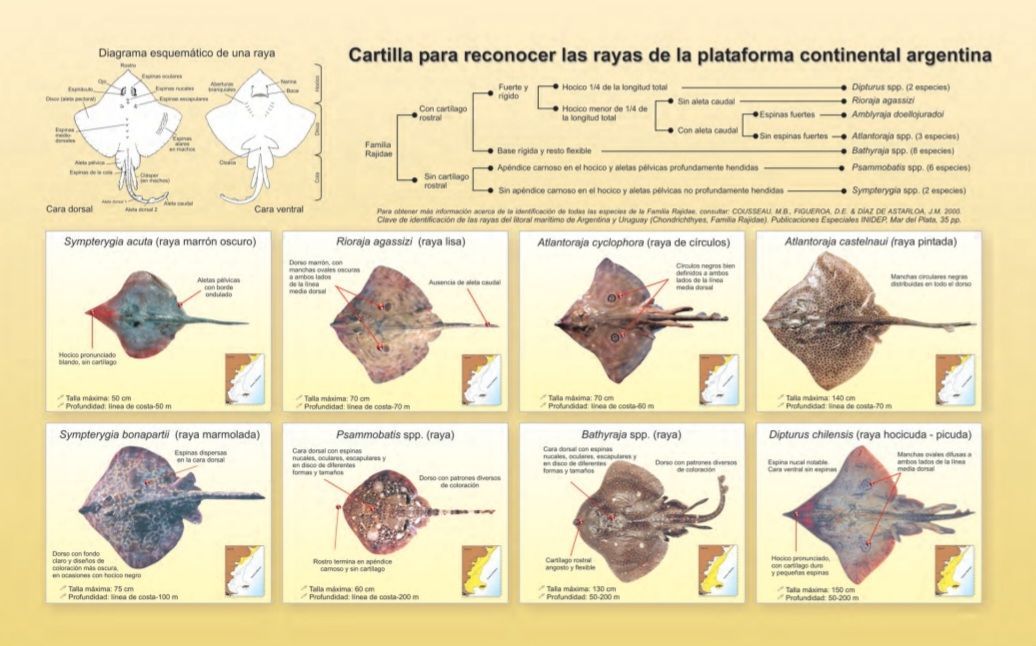 Estos animales se distinguen por la posición ventral y por la forma aplanada del cuerpo, en el que las aletas pectorales se unen al tronco formando un “disco”.