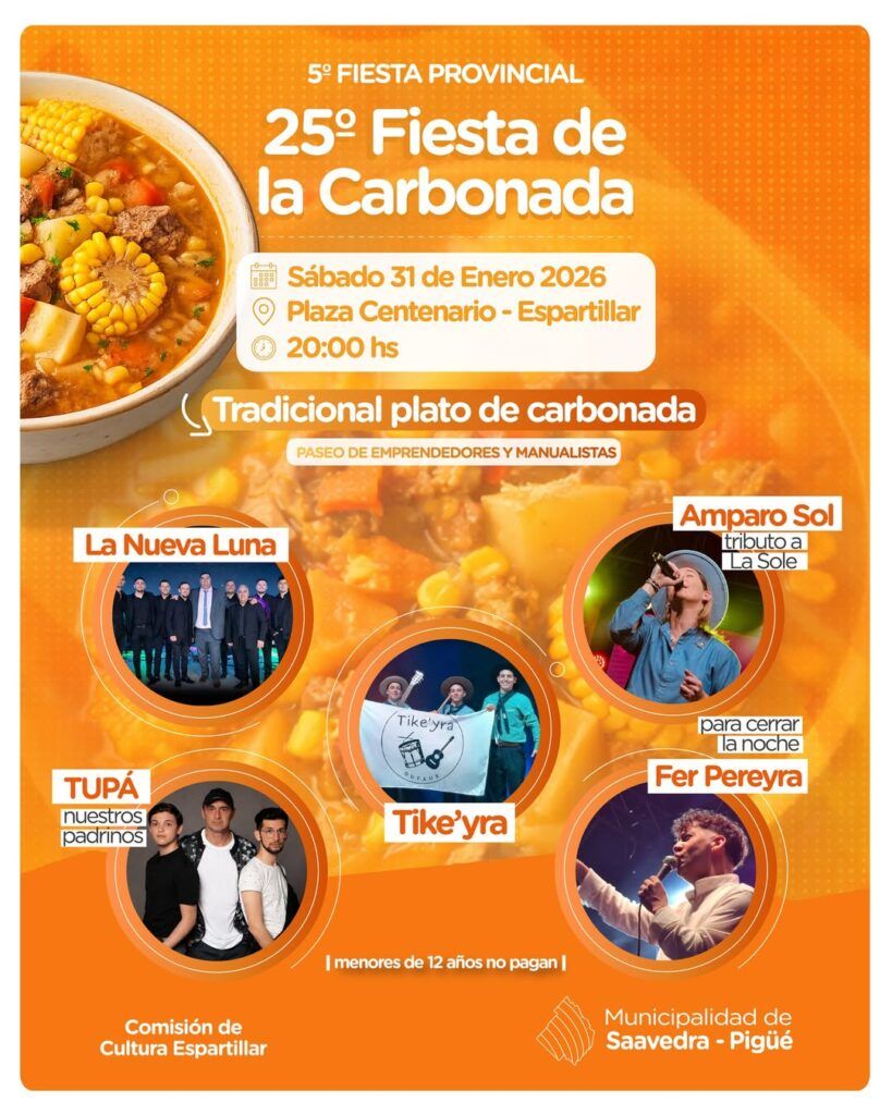 Espartillar se prepara para celebrar una nueva edición de la Fiesta de la Carbonada, uno de los eventos más representativos de la localidad. La cita será el sábado 31 de enero, desde las 20 horas, en la Plaza Centenario de este pueblo ubicado a unos 100 kilómetros de Bahía Blanca.