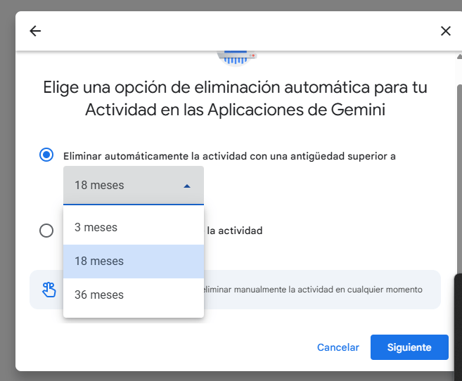 6. Allí, podrás elegir si la actividad se guarda por 3, 18 o 36 meses.