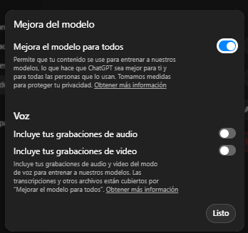 4. Desactivá la opción que permite usar tus chats para mejorar o entrenar el modelo.