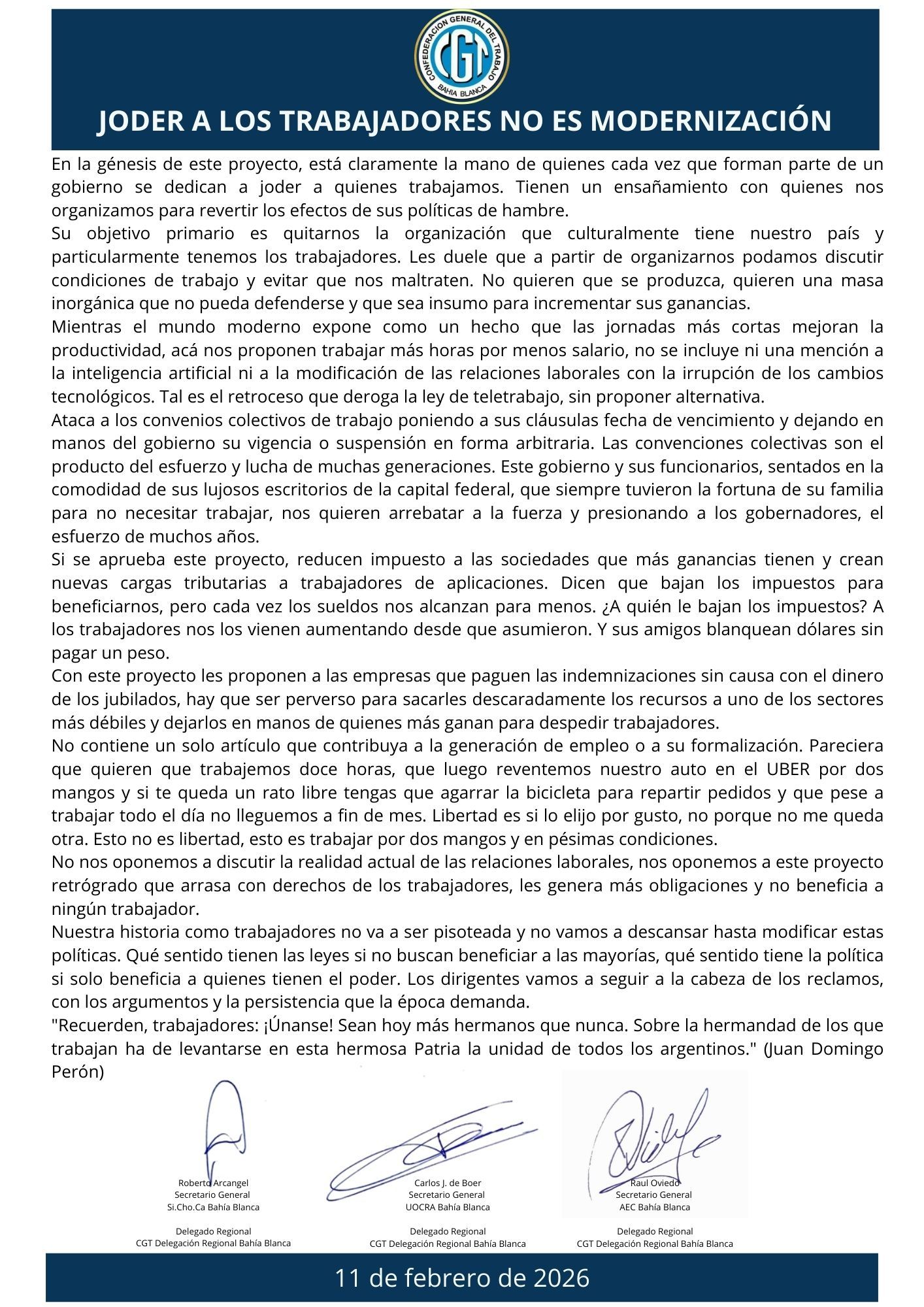 En el final de la marcha, en las escalinatas del Teatro Municipal, se leyó un documento en el que advierte que la iniciativa del Ejecutivo afectará los derechos de los trabajadores, flexibilizando de las condiciones laborales, debilitando la negociación colectiva y reduciendo la protección frente al despido.