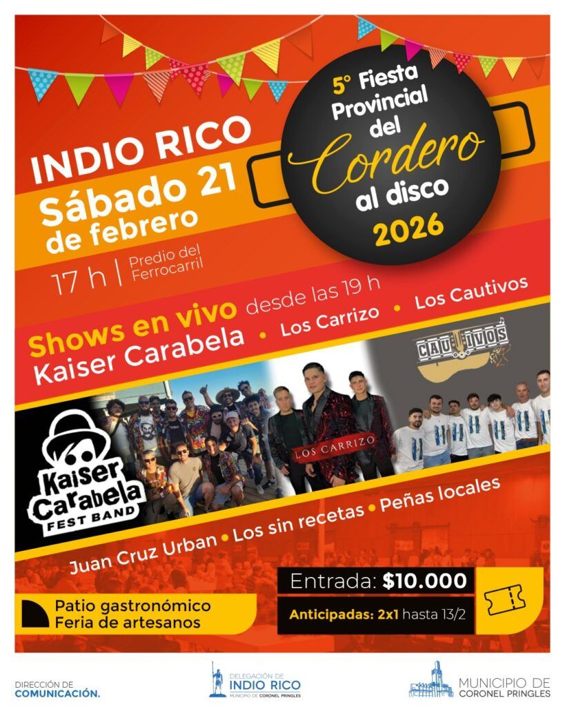 El sábado 21 de febrero, desde las 17 horas en el Predio del Ferrocarril, se va a realizar la 5° Fiesta Provincial del Cordero al disco en Indio Rico. Ubicado en el partido de Coronel Pringles, el pueblo está a poco más de 2 horas de distancia en auto.