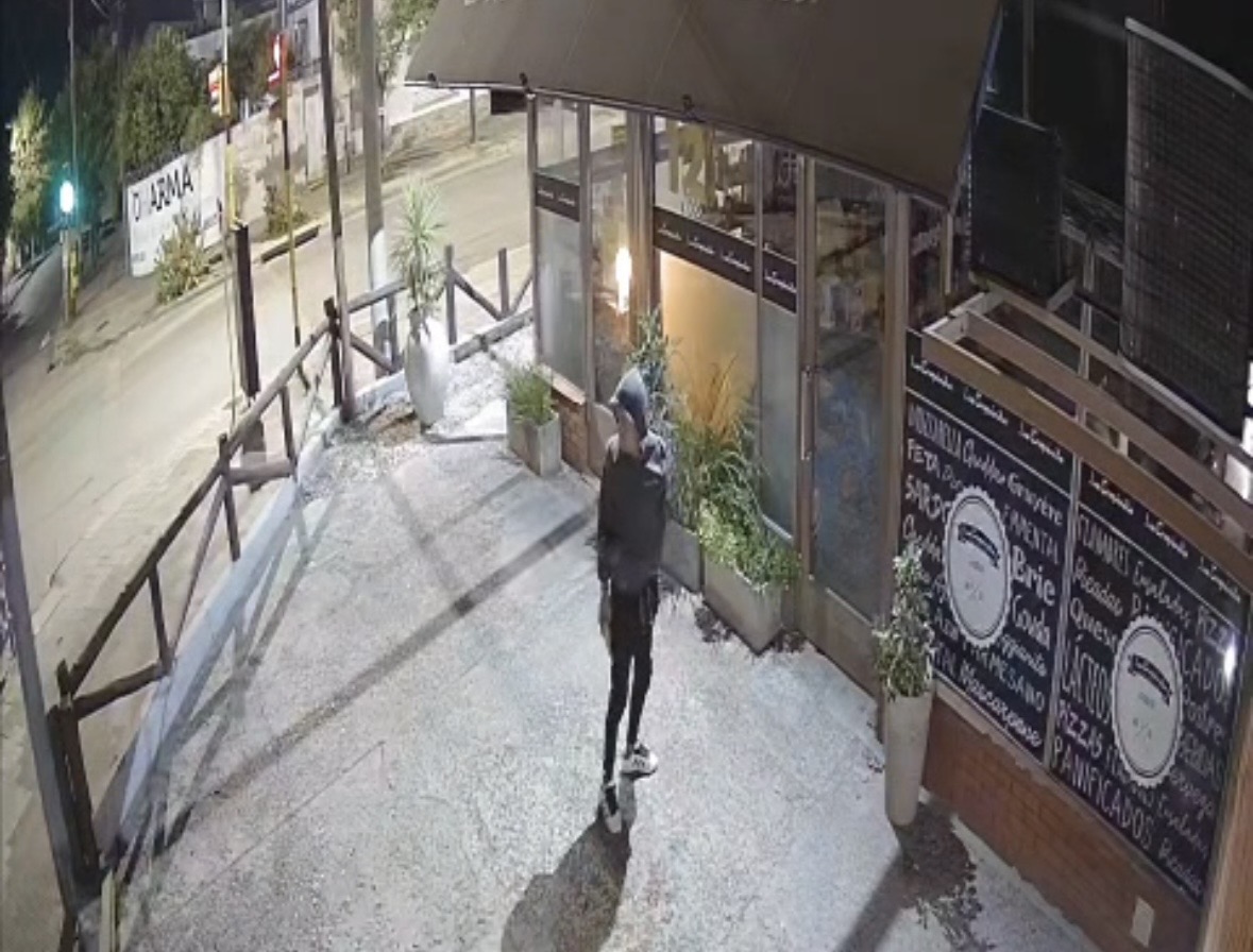 En la madrugada del martes, las cámaras de seguridad de un local gastronómico ubicados en la esquina de Almafuerte y Charlone capturó un hecho delictivo de parte de un joven aún no identificado.