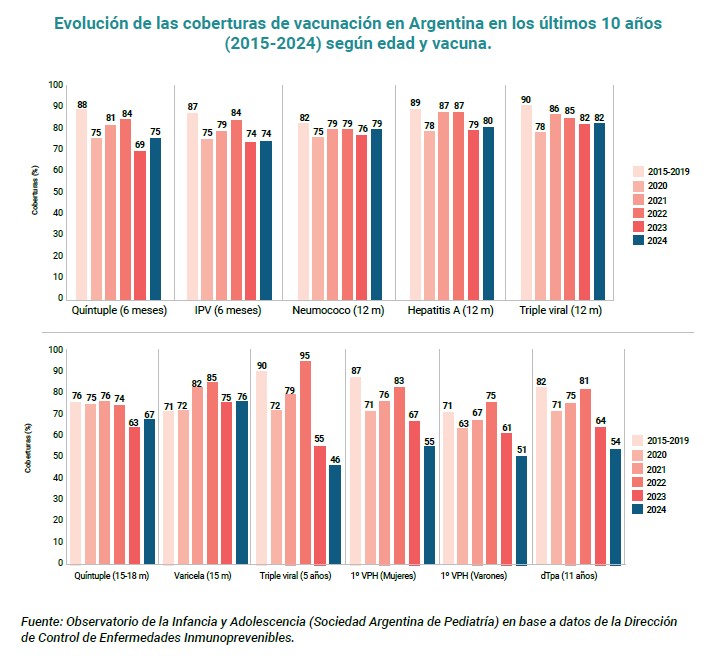 Según un informe publicado en julio de 2025 por la Sociedad Argentina de Pediatría (SAP) que puede consultarse aquí, “la comparación entre los valores registrados en 2015 (referencia prepandémica) y los de 2024 evidencia una caída generalizada en todos los grupos de edad y vacunas analizadas, con especial preocupación en los refuerzos y esquemas de la segunda infancia y adolescencia”