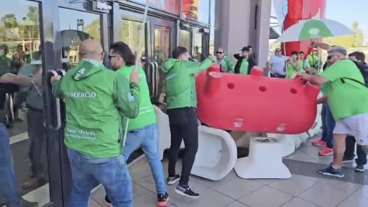 Un grupo de manifestantes del sindicato de Empleados de Comercio se encuentra en las afueras del Bahía Blanca Shopping.