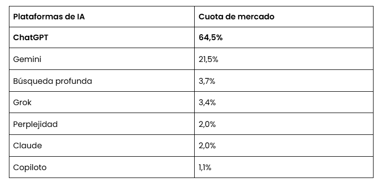 El escenario muestra que, aunque mantiene el liderazgo, la plataforma enfrenta una competencia creciente que comienza a reducir su dominio en el mercado de la inteligencia artificial.