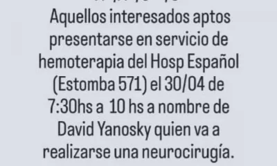 Se buscan dadores de sangre para un chico que se va a realizar una neurocirugía. Se llama David Yanosky y está internado en el Hospital Español....